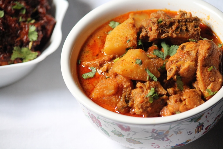 Pieces of chicken & potatoes cooked in spices with hot chili sauce garnished with fresh coriander